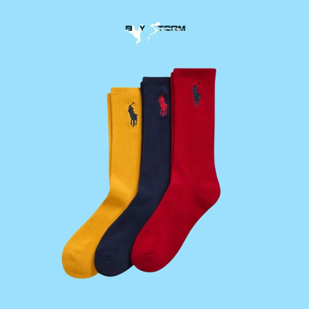 Step up your sock game with this vibrant 3-pack of crew socks in bold yellow, navy blue, and red. Each pair features a classic embroidered polo-style logo for a touch of sporty elegance. Soft, breathable, and perfect for everyday wear or standout streetwear looks.