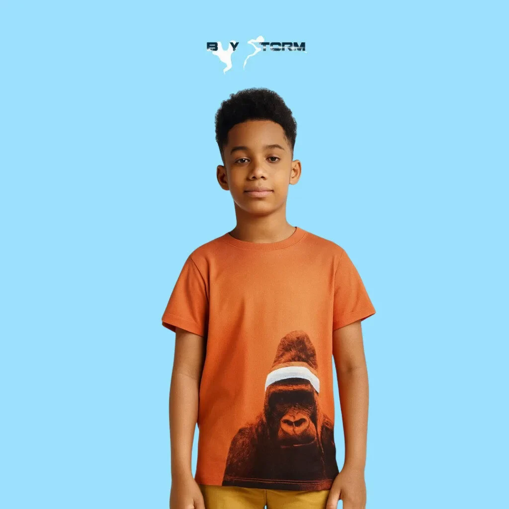Add bold attitude to your child’s wardrobe with this Kids’ Gorilla Graphic T-Shirt, featuring a cool gorilla print with a sporty headband on a vibrant orange base. Made from soft, breathable cotton, this short sleeve tee offers comfort and standout style for school, weekend outings, or playtime. A fun and expressive choice for kids who love animal prints and unique fashion.