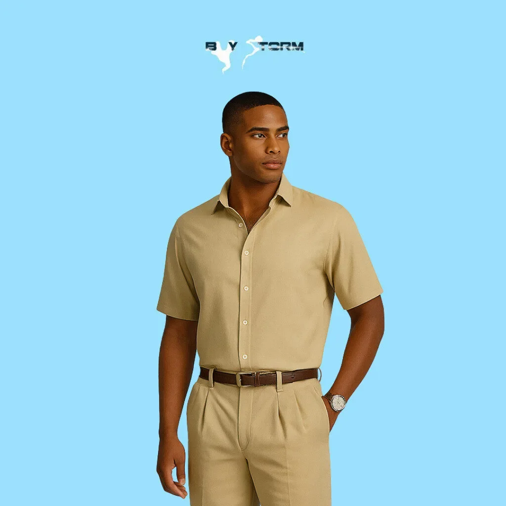 Stay effortlessly stylish with this Men’s Beige Short Sleeve Button-Down Shirt, designed for lightweight comfort and modern flair. Featuring a crisp collar, clean front buttons, and a tailored fit, this versatile shirt is perfect for warm-weather outings, office casual looks, or weekend wear. Made from breathable fabric, it offers all-day ease and pairs well with jeans, shorts, or chinos. A timeless addition to any men’s wardrobe.