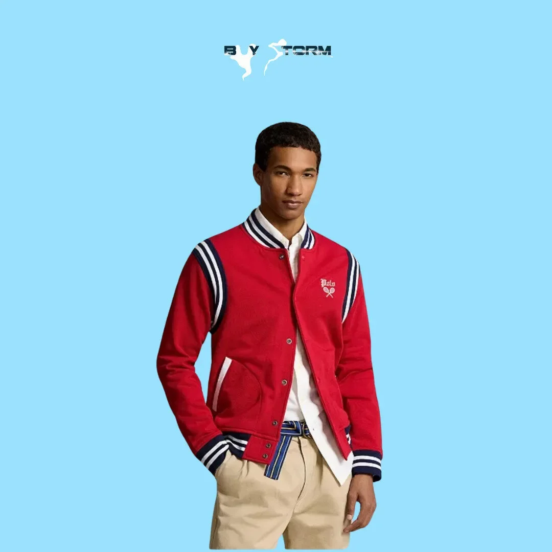 • Classic red varsity design with contrasting navy and white trim • Premium cotton material with embroidered logo details • Perfect for campus life, game days, or retro-inspired outfits
