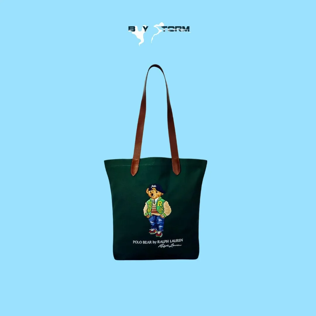 • Rich forest green canvas with contrasting brown leather handles • Adorable preppy bear character embroidered artwork • Spacious interior perfect for daily essentials • Perfect for shopping, campus life, or adding preppy flair to any outfit