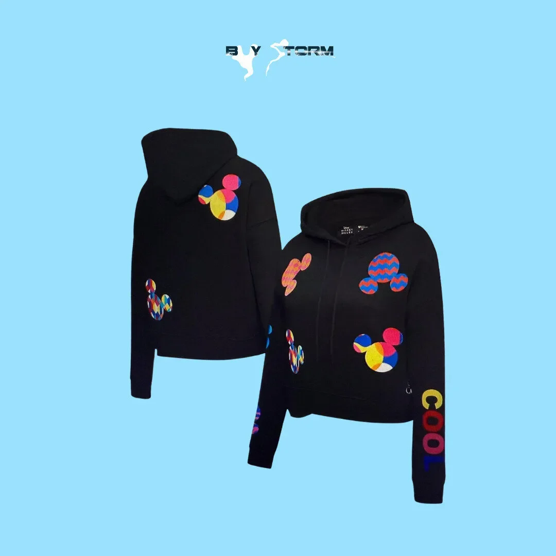 Show off your playful side with this women’s black graphic hoodie featuring vibrant cartoon-inspired patches and bold “COOL” lettering on the sleeve. Crafted for cozy comfort with a cropped fit and adjustable hood, this street-style piece brings color and fun to your casual wardrobe. Perfect for fans of quirky fashion and bold statement looks.