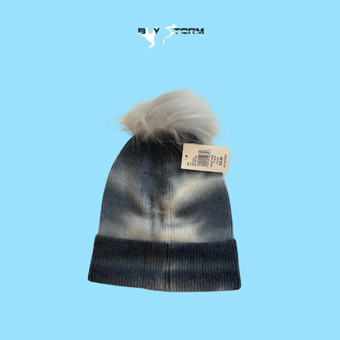 Women’s Blue Tie-Dye Beanie with White Faux Fur Pom – Cozy Winter Knit Hat