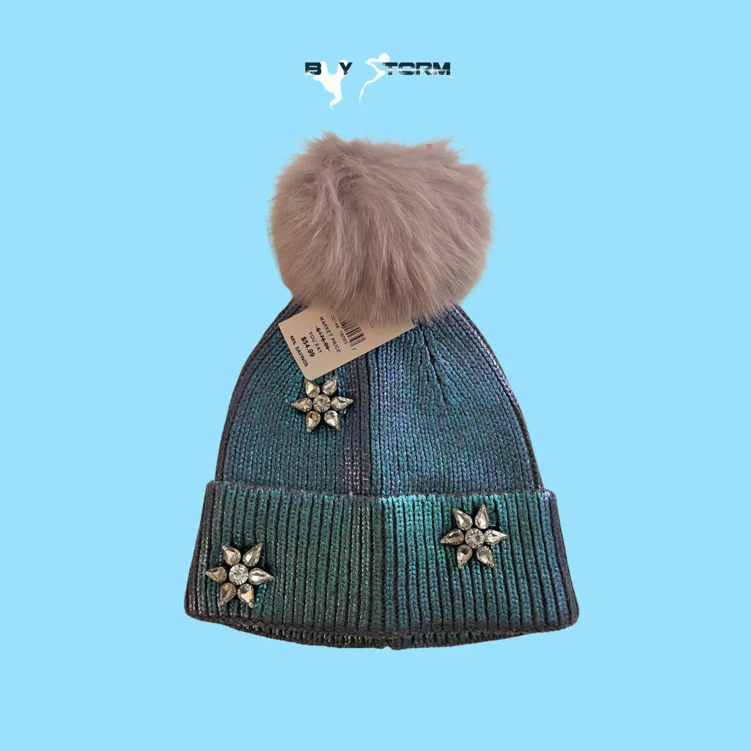 Stay cozy and elegant with this teal-toned shimmery knit beanie featuring a soft faux fur pom-pom and sparkling crystal snowflake embellishments. Designed for warmth with a stylish twist, this women’s winter hat is perfect for festive outings, seasonal photos, or everyday cold-weather glam. A chic accessory for winter wardrobes.